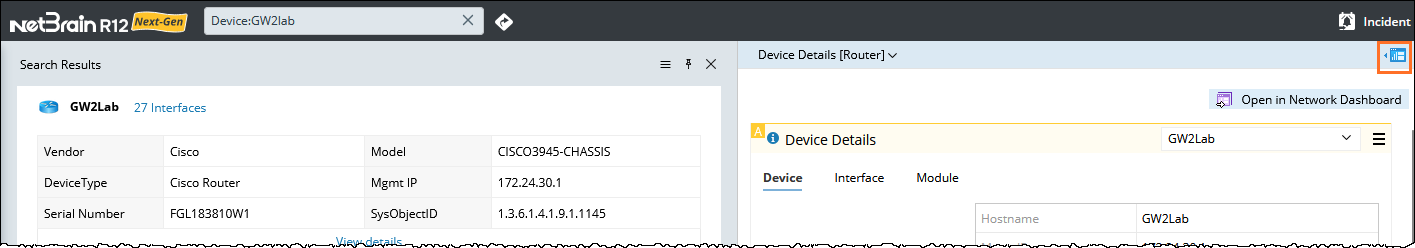 - Enter a specific device hostname in the search field. For example, device:GW2Lab.