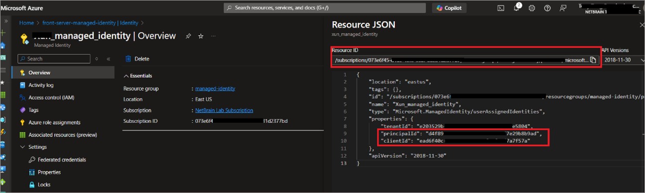 - Find the management Client ID, Object ID(PrincipalId) or Resource ID from Json view of Azure Portal.