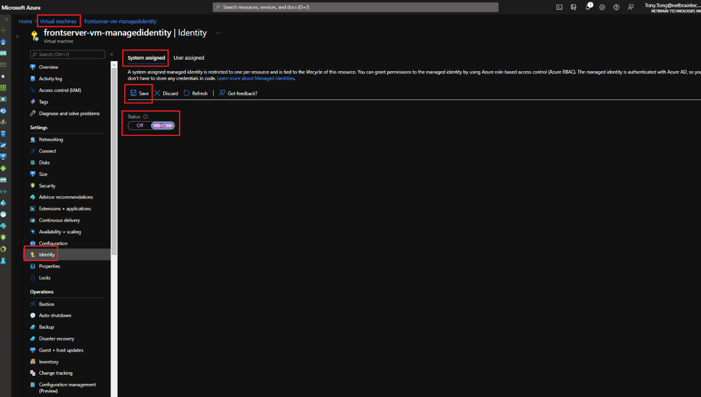 - Go to the Identity page of a Virtual Machine, which will be used as a NetBrain server from Azure Portal.
