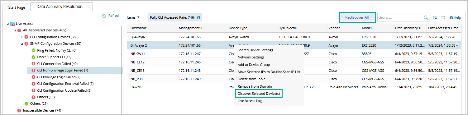 - Multi-select the entries in the list by pressing the Ctrl or Shift key, right-click them and select Discover Selected Device(s).