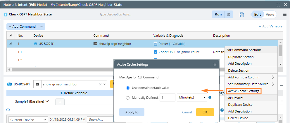 Use Active Cache aims to safeguard network devices against excessive Telnet/SSH requests. This option is available for the Live Data data source setting in network intent execution/replication/decoding. Essentially, it ensures that live data retrieval from devices occurs only when cache data is unavailable or outdated. Furthermore, all live retrieved data is added/updated into a global Active Cache for future live data requests.