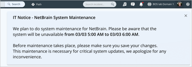 Note: Within the latest 7 days before the Planned Start Time, a system maintenance window shows up after logging in NetBrain system until the Planned End Time is up or the maintenance starts.