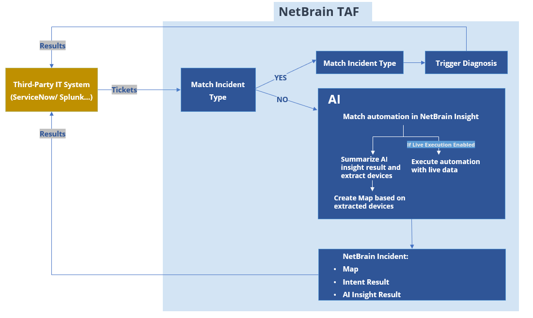 When an API call (Alert from Splunk, Incident from ServiceNow, and so on) comes in from the 3rd party system, NetBrain TAF will process it.