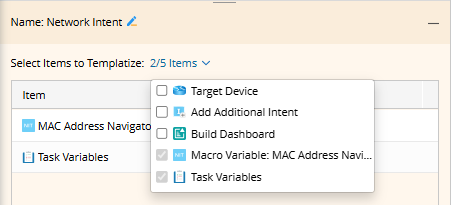 Select the Network Intent node and Select Items to Templatize section will appear at the bottom. The following components can be configured as template variables: