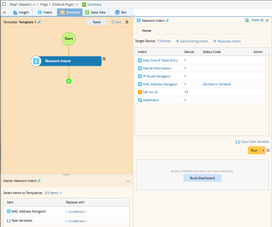 Note: The intent scope cannot be defined here. During runbook instantiation, all intents will be included in the dashboard. To exclude certain intents, manually edit the dashboard post-instantiation.