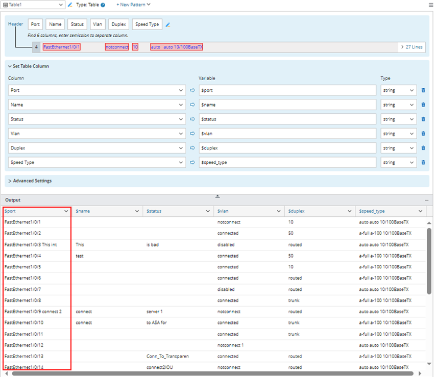 When a device command output looks similar to a standard table format but only misses a table header line, you can define text replacement to replace the line of text ahead of the table data with a customized table header line. This twist allows you to continue to define a Table Parser to parse the table data. - Fill Up Table Headers