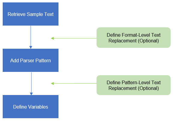 - Pattern level: You can define multiple patterns in a single format. Text replacement can be defined for an individual pattern. The system searches for and replace text within the specified range that matches the parser definition of that pattern.