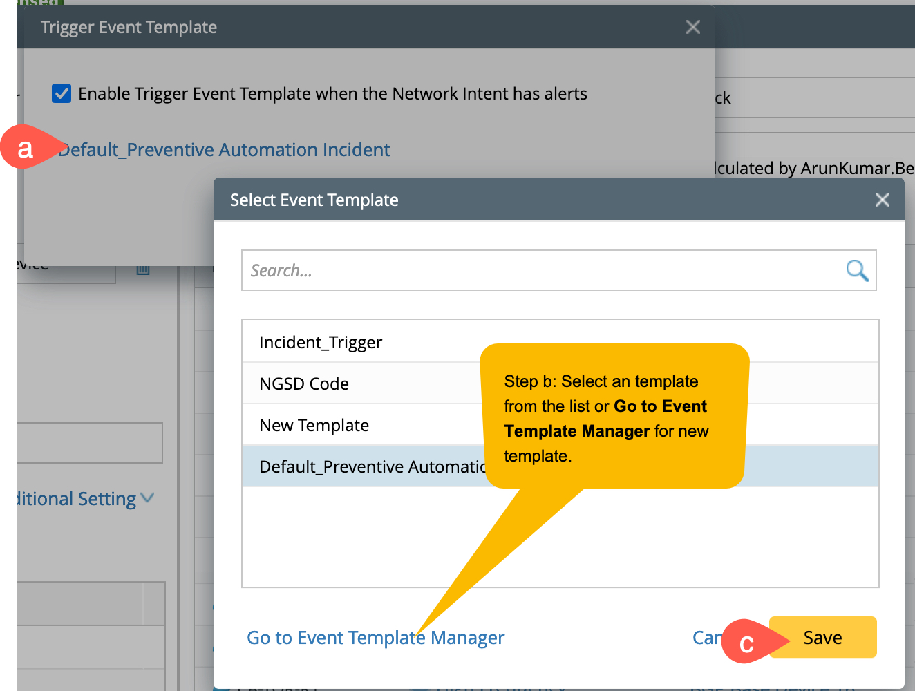 - Select the appropriate template and you can further add an event template from the Go to Event Template Manager.