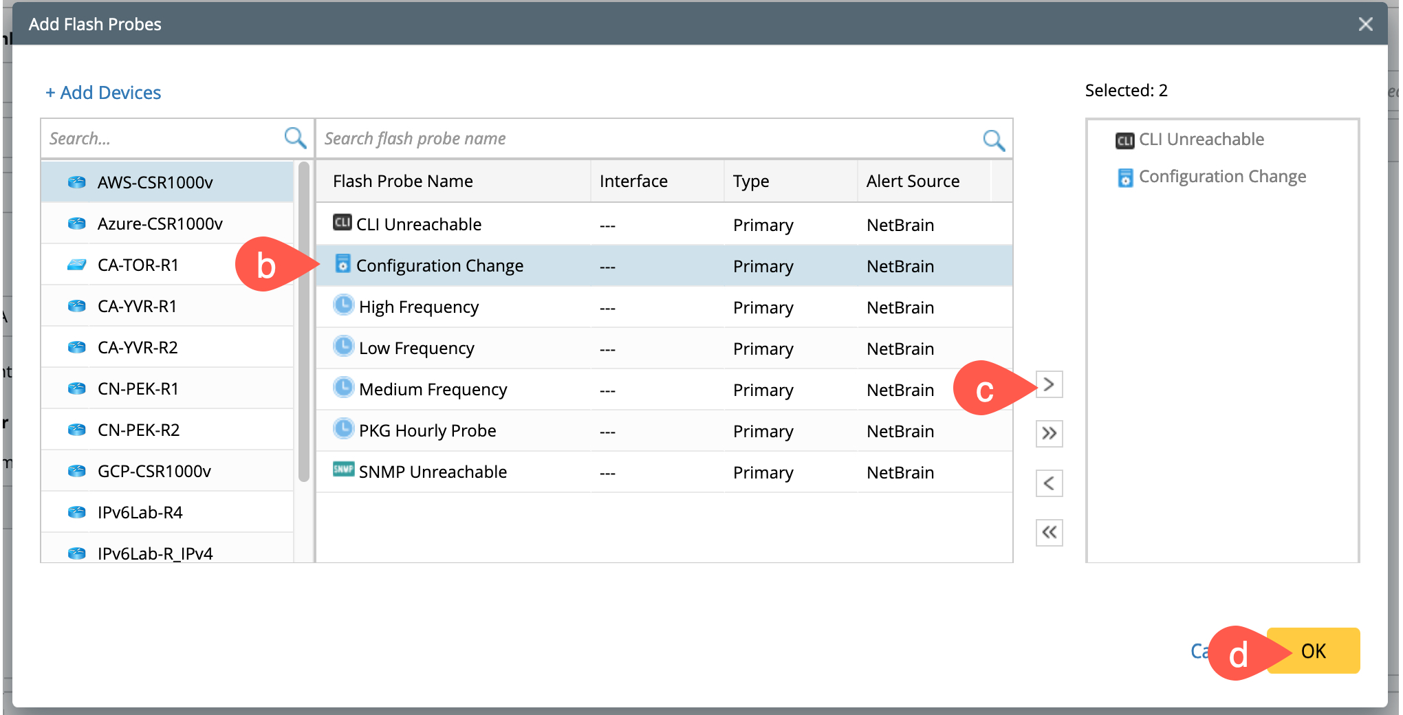 Note: You can add more devices if needed using +Add Devices in the Add Flash Probes window. - Choose all the required probes corresponding to the selected device(s).