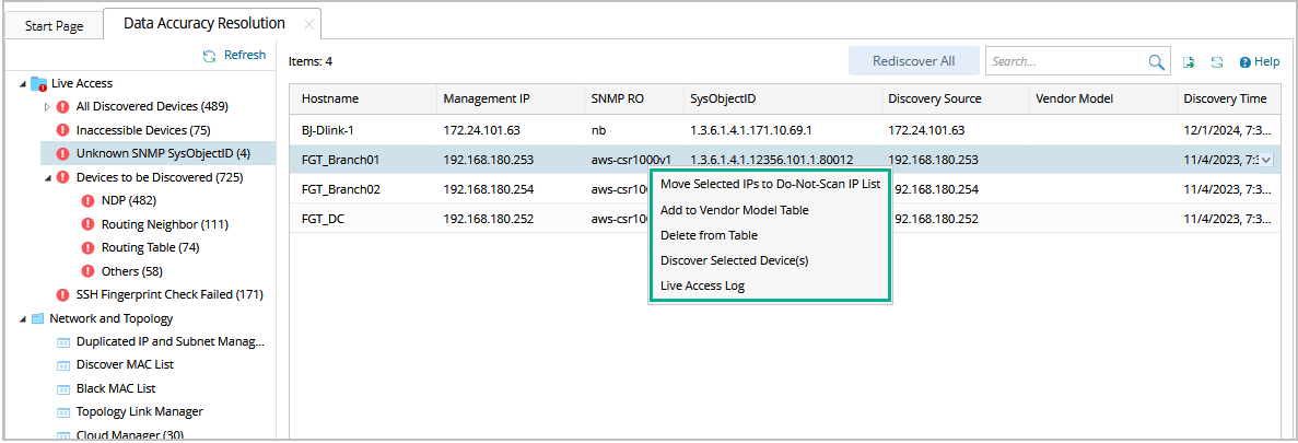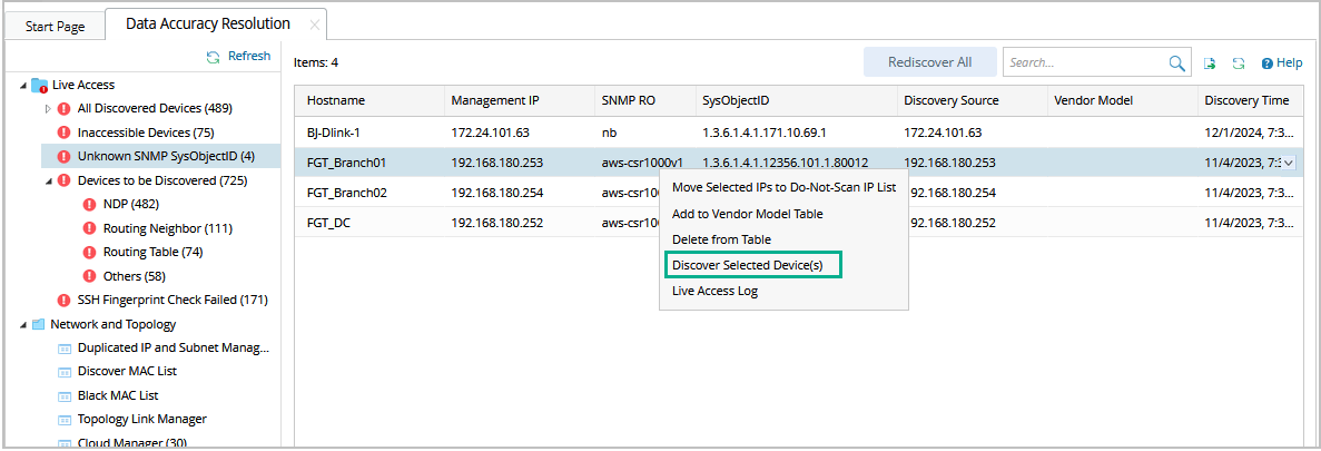 - In the Data Accuracy Resolution tab, select Unknown SNMP SysObjectID in the left pane. The devices with unknown SNMP sysObjectIDs are listed.