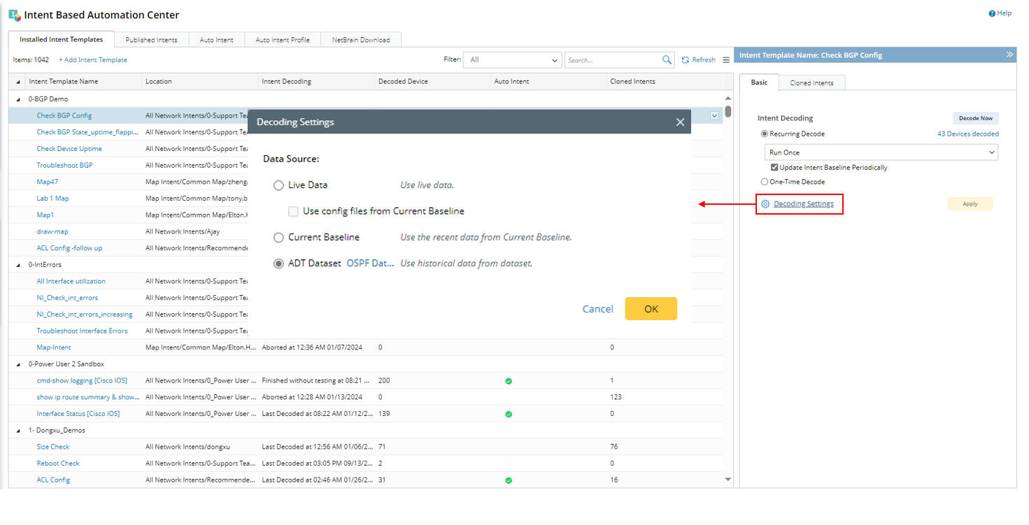 To use the ADT dataset for intent replication, you should install the NIT and decode it first. Decoding NIT can be done using ADT dataset as data source. In the current version, ADT dataset is a type of data source for decoding intent in both the IBA Center and Auto Intent Wizard (Step 2).