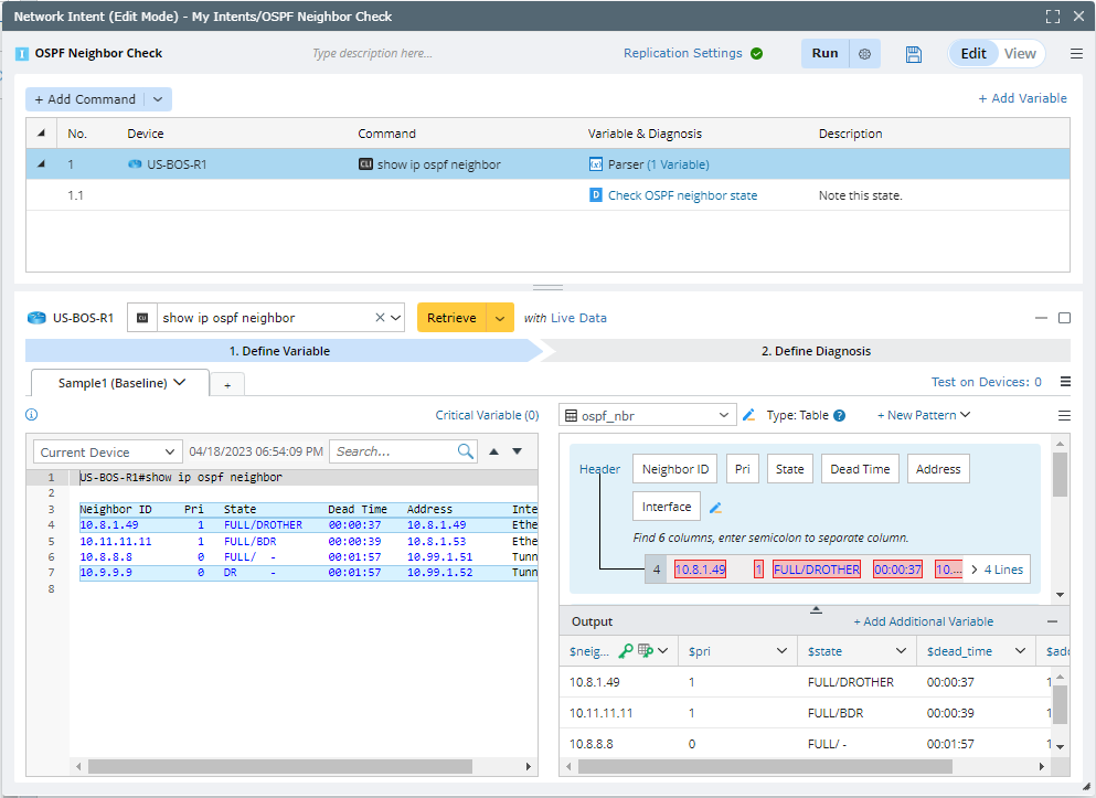 - Create a NI “OSPF Neighbor Check” and add CLI diagnosis for device “US-BOS-R1”. Get a parsed table by command show ip ospf neighbor.