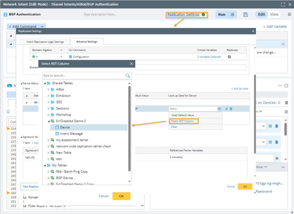 When an intent template is installed into the Intent Based Automation Center, the Decoding Engine at the backend will attempt to clone and run the intents for all the qualified devices in the domain. When this intent template is applied to TAF/PAF/Auto Intent, intents are cloned for specific target devices. Some of these intents have macro variables to be assigned a value in the intent decoding. Data in ADT fields can be used to define the value Macro Variables.