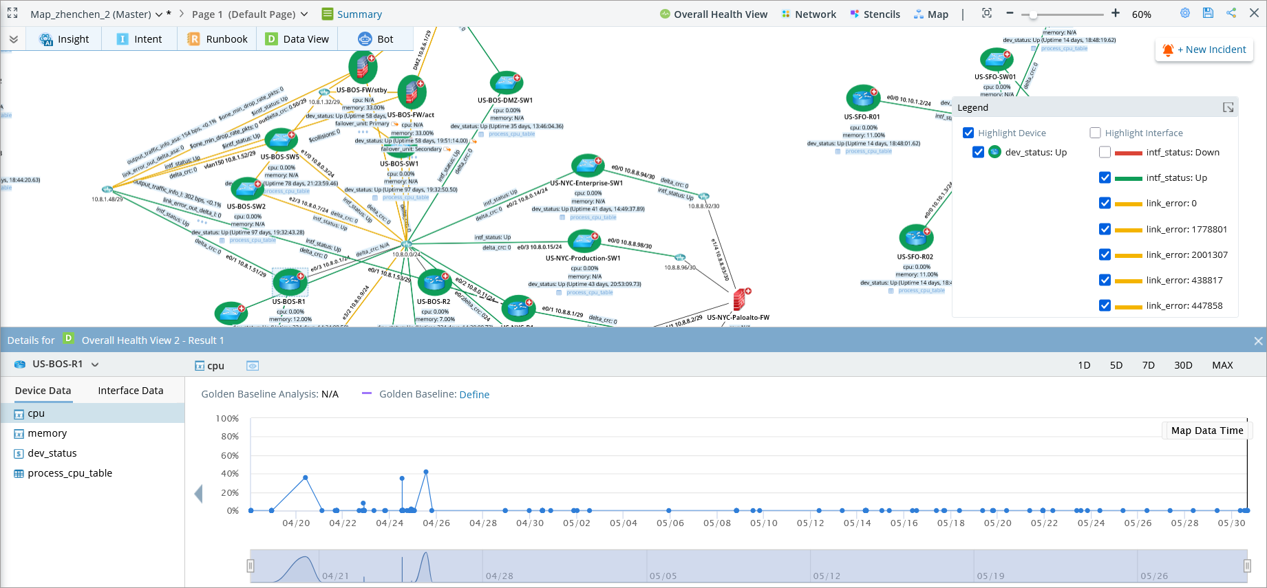 One element that makes NetBrain maps dynamic is the rich level of detail available for each device. Every icon on the map represents an object with potentially hundreds of associated attributes. As you zoom in, additional data may become visible, appearing beneath the device icons and along the links, providing a deeper, contextual view of your network.