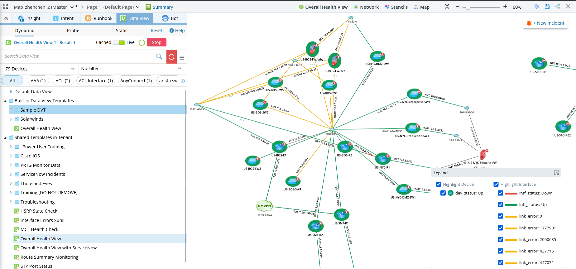 Beyond the built-in default data, you can visualize any network information using Dynamic Data Views (DVTs). A DVT is a customizable container that displays selected data directly on the map. It allows you to scale diagnostics across a device, a full map, or an entire Site, which makes DVTs a powerful tool for network engineers who need to monitor, investigate, and troubleshoot at scale.