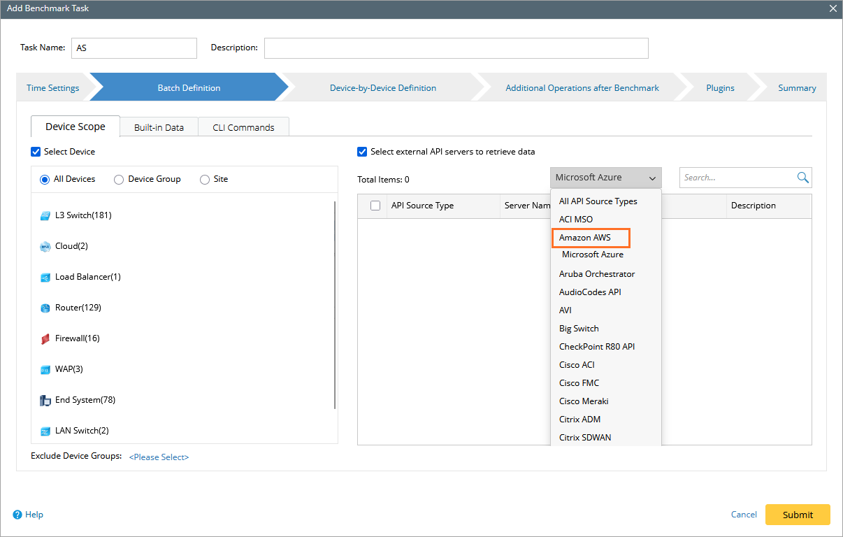 - Update Schedule Benchmark Task: After the discovery process, the corresponding data for the AWS accounts will be added to the system. The system will then need to run the benchmark to update the AWS data. If you have selected certain AWS accounts for the discovery, you will need to add these newly added accounts to the benchmark scope, as shown in the screenshot below.