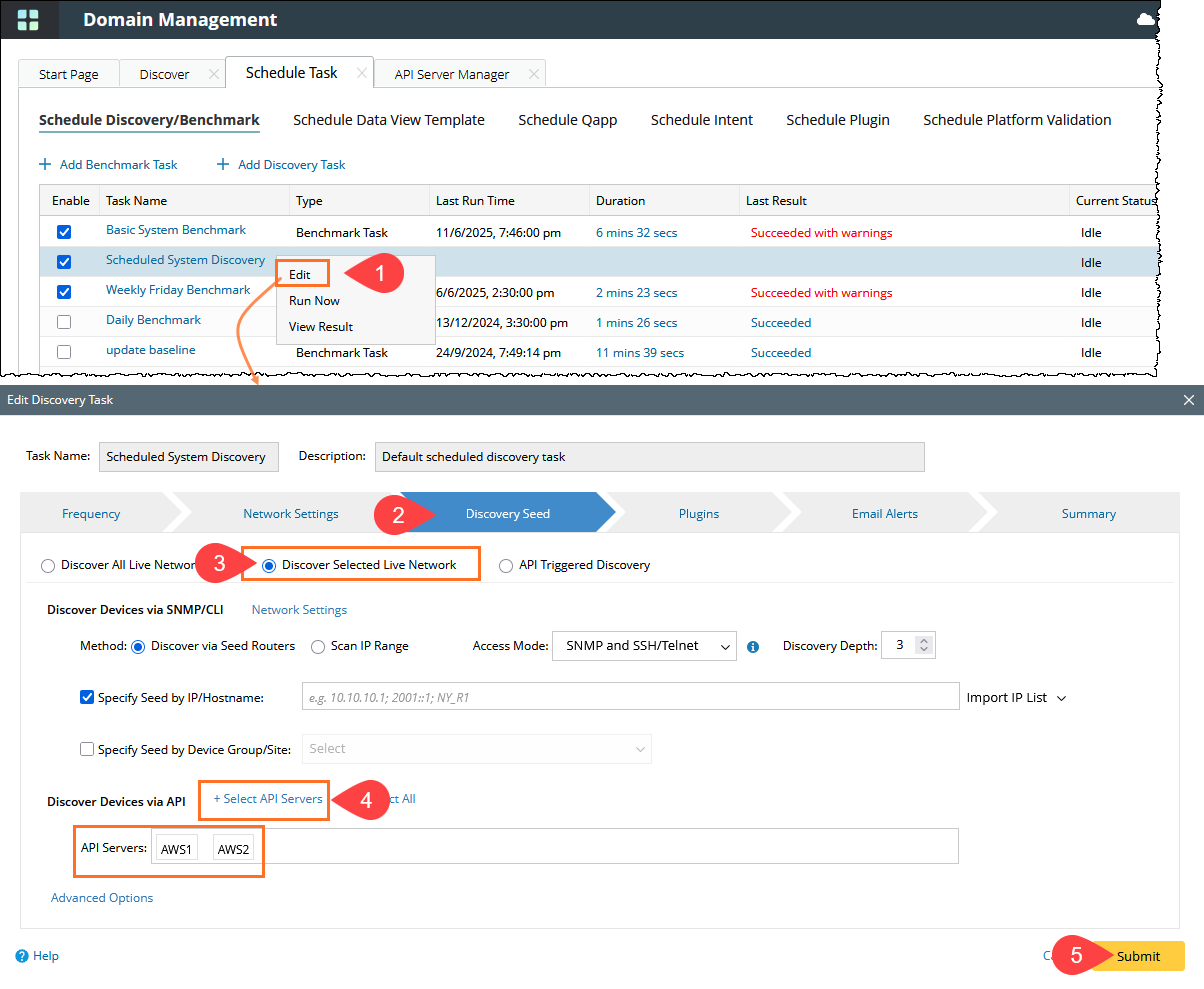 - Update Schedule Discovery Tasks: After adding the AWS accounts into NetBrain, you will need to add these accounts into the scheduled discovery process.