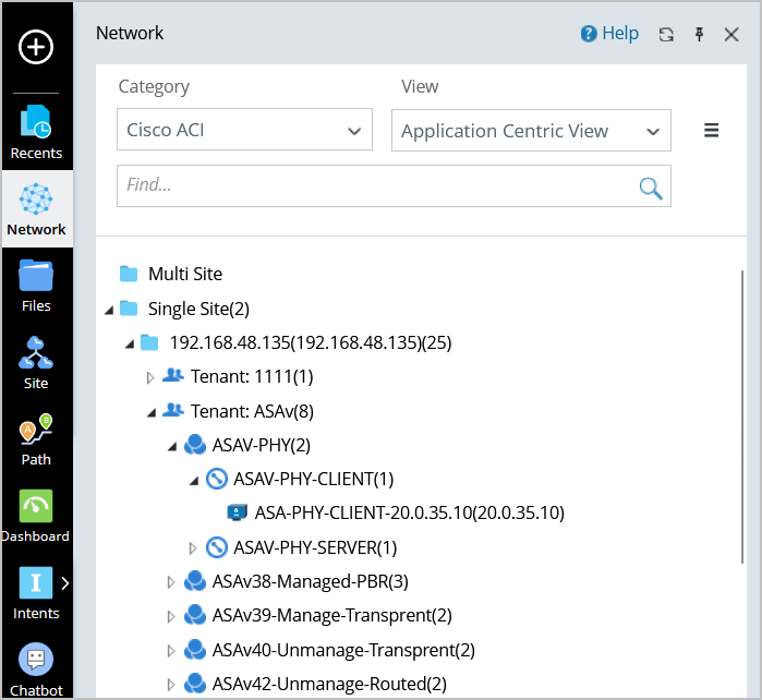 The application-centric view allows you to see different tenants and the applications deployed under each. The ACI data model is organized as Tenant > Application Profile > EPG > Endpoint. In the Network pane, you can view the applications deployed over an ACI Fabric and the application structure.