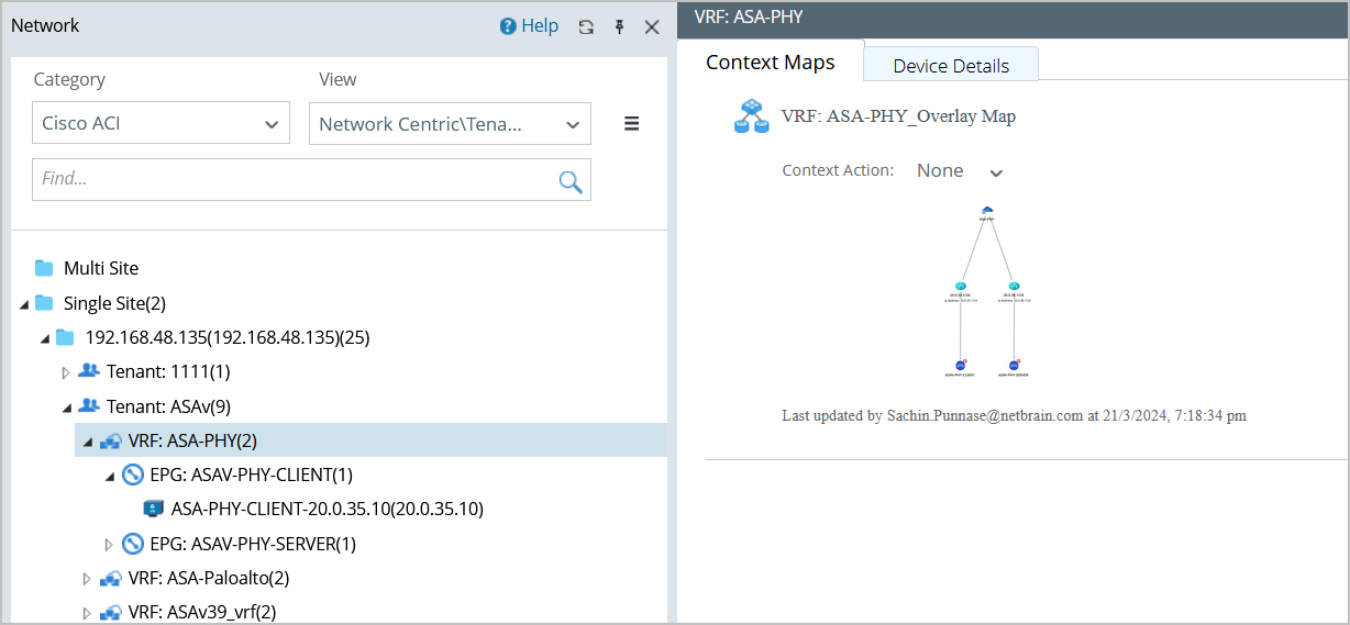 - Click a VRF node. You can view the overlay/underlay context map of this VRF.