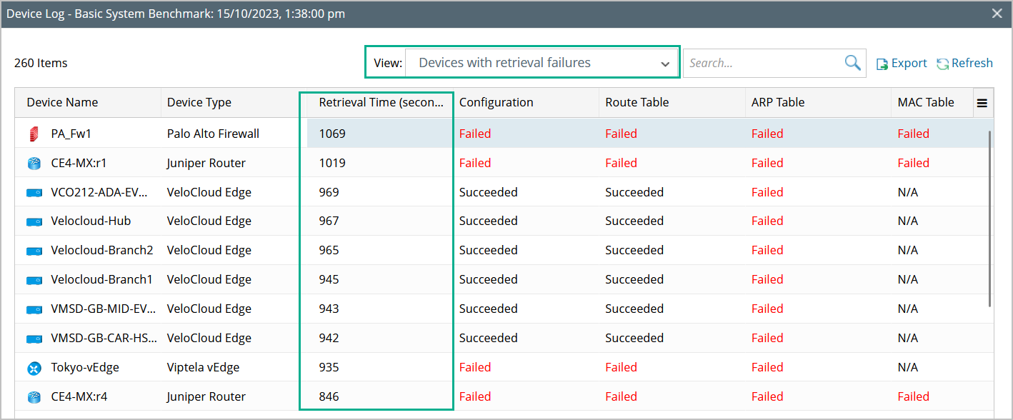 - Click Export to export the log files. In the exported log file, the Retrieval Time (seconds) column now appears next to the Device Type column.