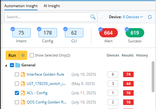 The Automation Insight tab organizes the golden configs by rule, with each row displaying one rule. Each rule might contain multiple devices.