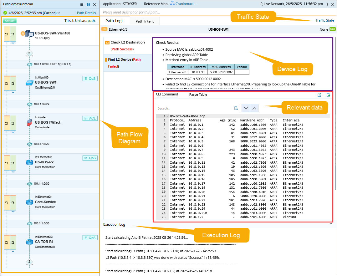| Relevant Data | Display relevant data which is used for path calculation. | Choose the 'CLI command' or 'Data Table' tab to view the raw CLI data or parsed data table. |
