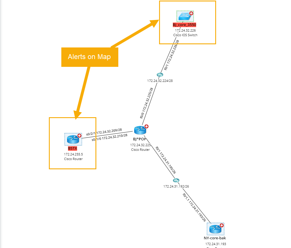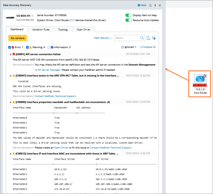 On the NetBrain map, if devices on the map have alerts from System Validation or Platform Validation, the corresponding hostnames will be highlighted with an alert icon. The color red indicates errors.