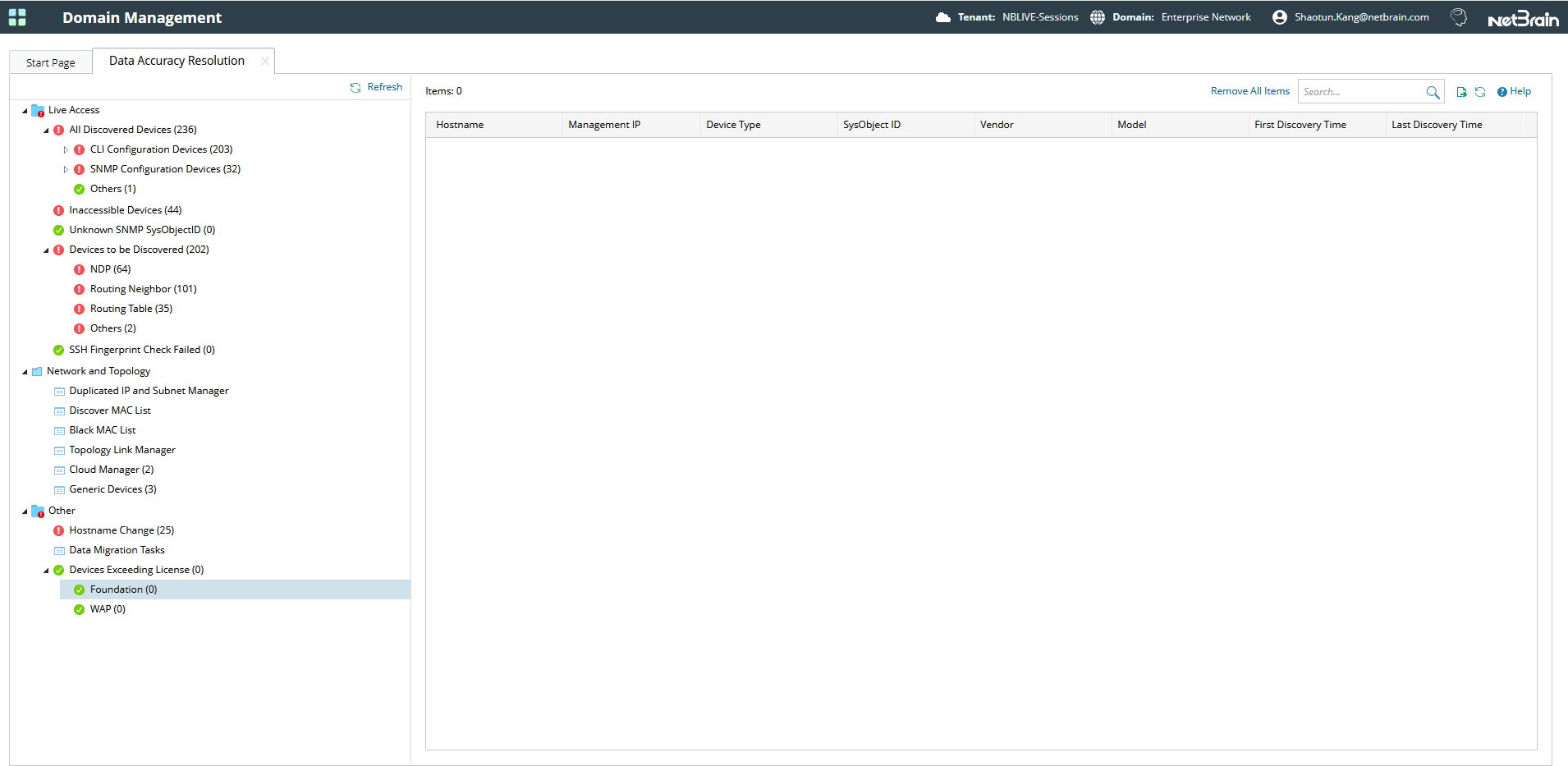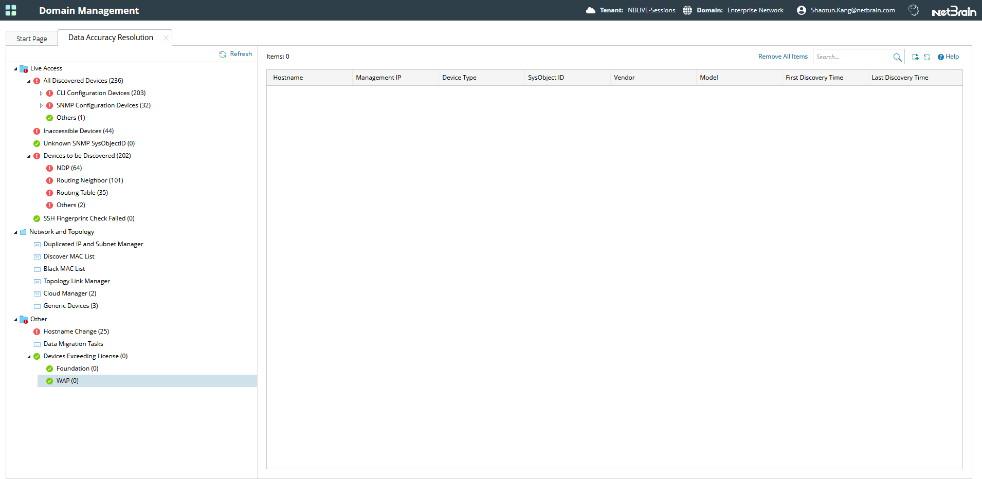 If you need to view the devices discovered after exceeding the license limit, go to Domain Management > Data Accuracy Resolution > other.