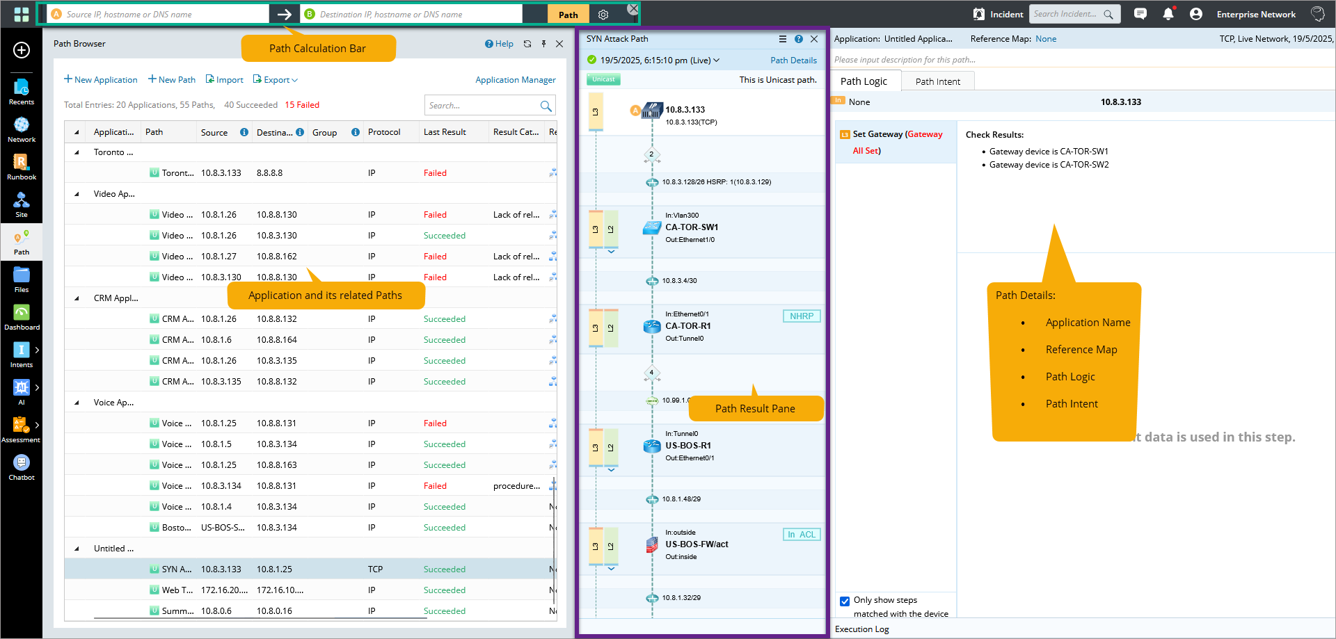 During troubleshooting, users can recalculate live paths and compare paths between live and cached data to reveal various issues behind a slow application. - Execute Path Intent and Diagnose Issues (during troubleshooting)