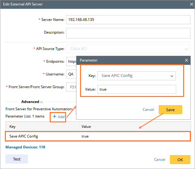 - In the Edit External API Server dialog, click Advanced and then Click + Add.