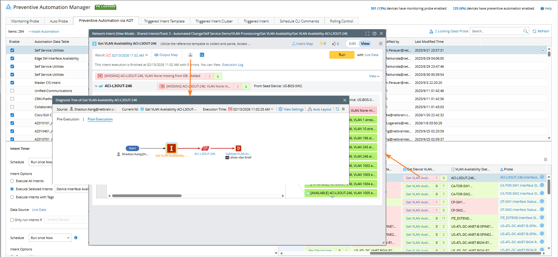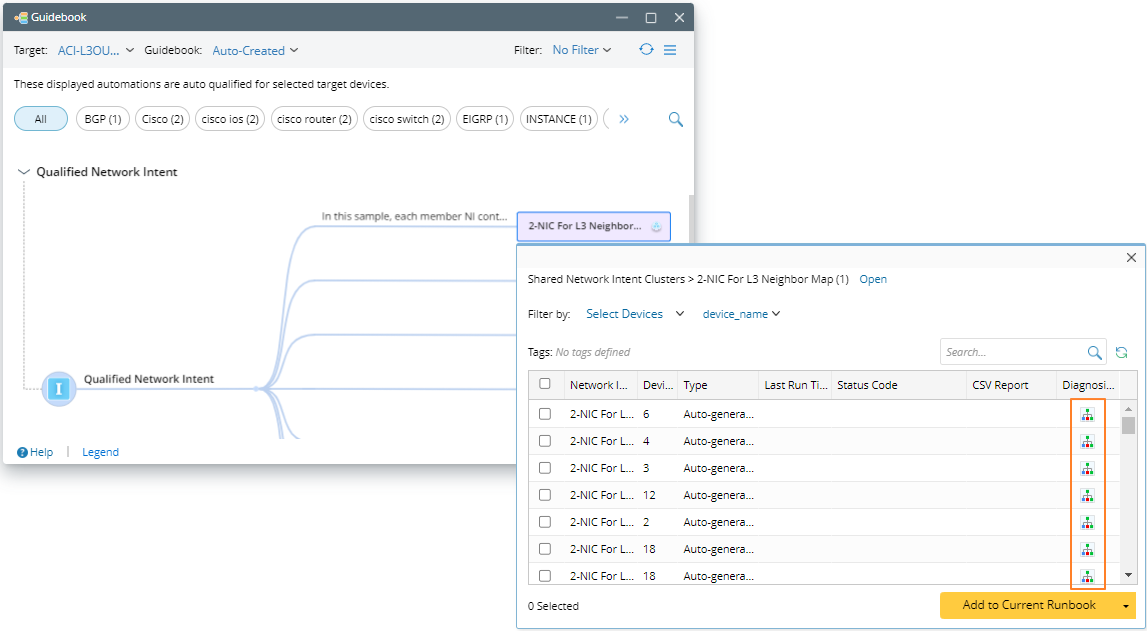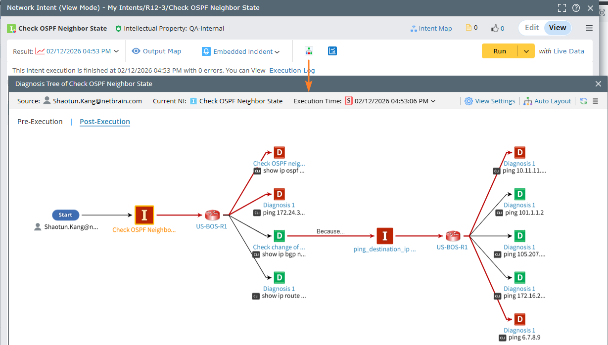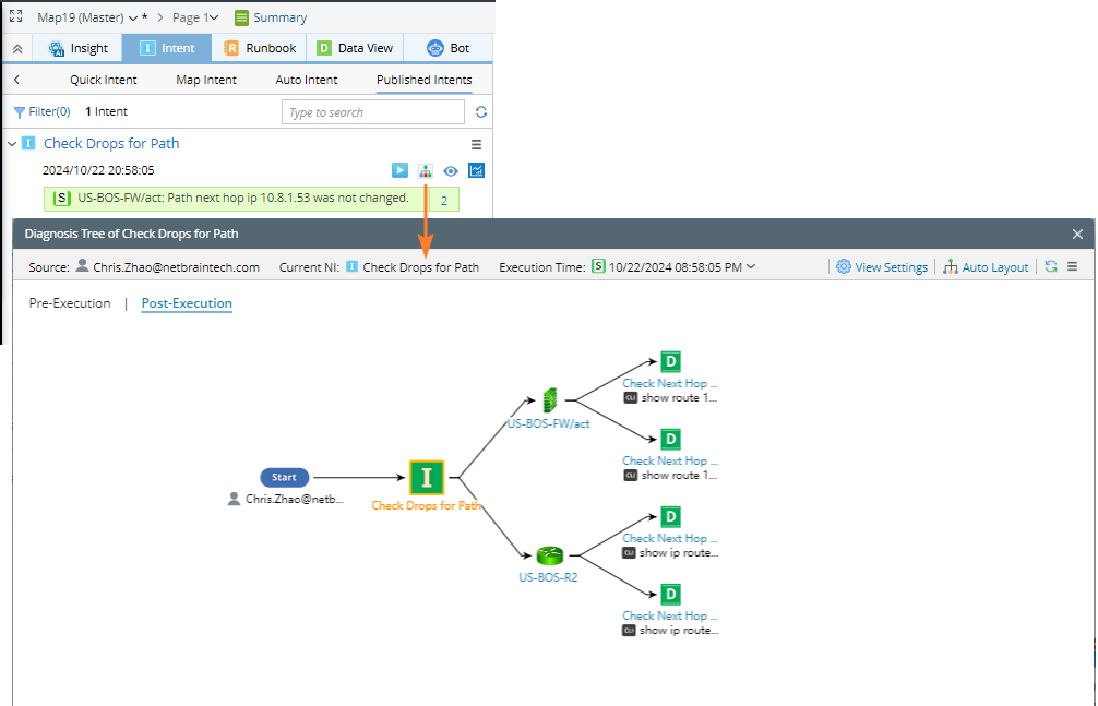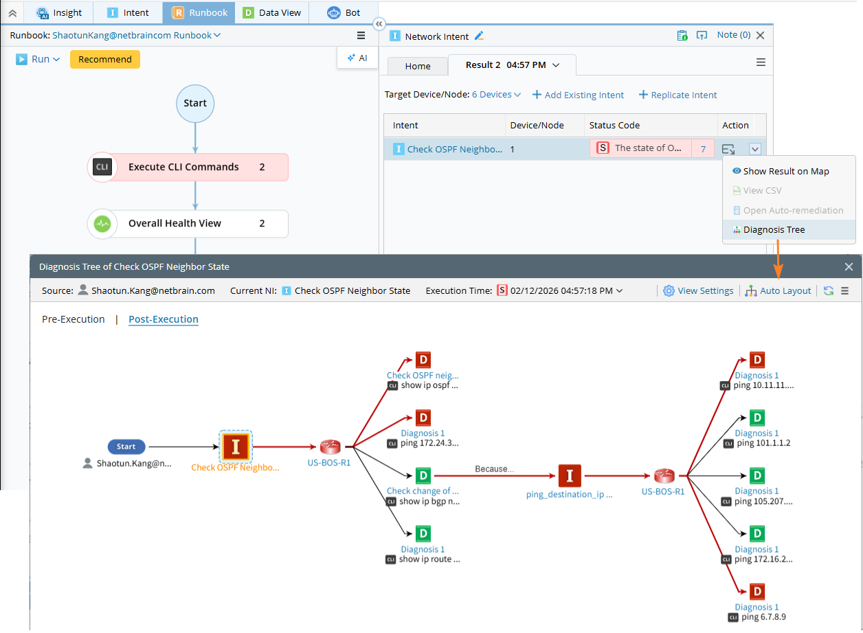 The NI in the NI node of the Runbook is still selected from the NI Manager, so only the home NI can be selected. After the home NI and follow-up NIs are executed, only the execution result of the home NI will be displayed in the Runbook. The result of follow-up NI will not be displayed in the Runbook, and you can view the execution result of follow-up NI through the diagnosis tree.