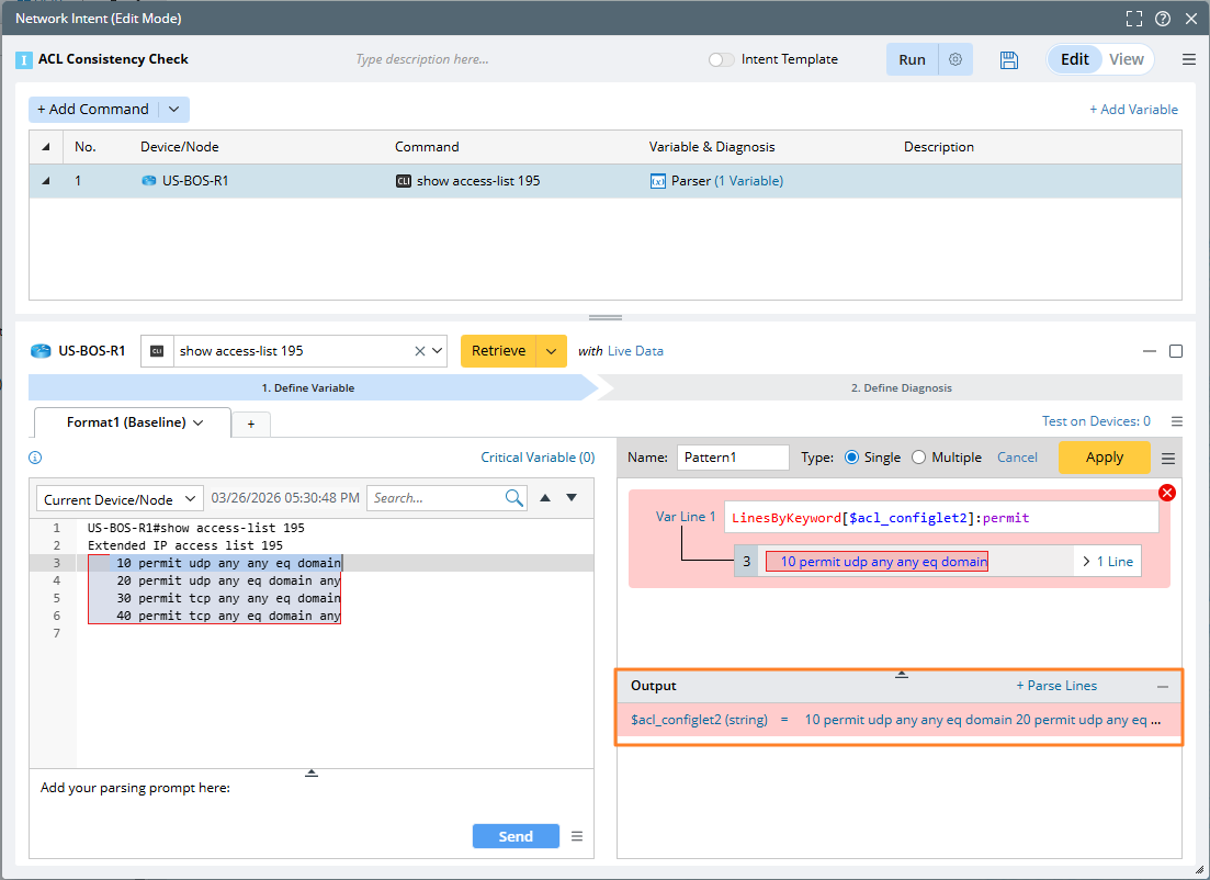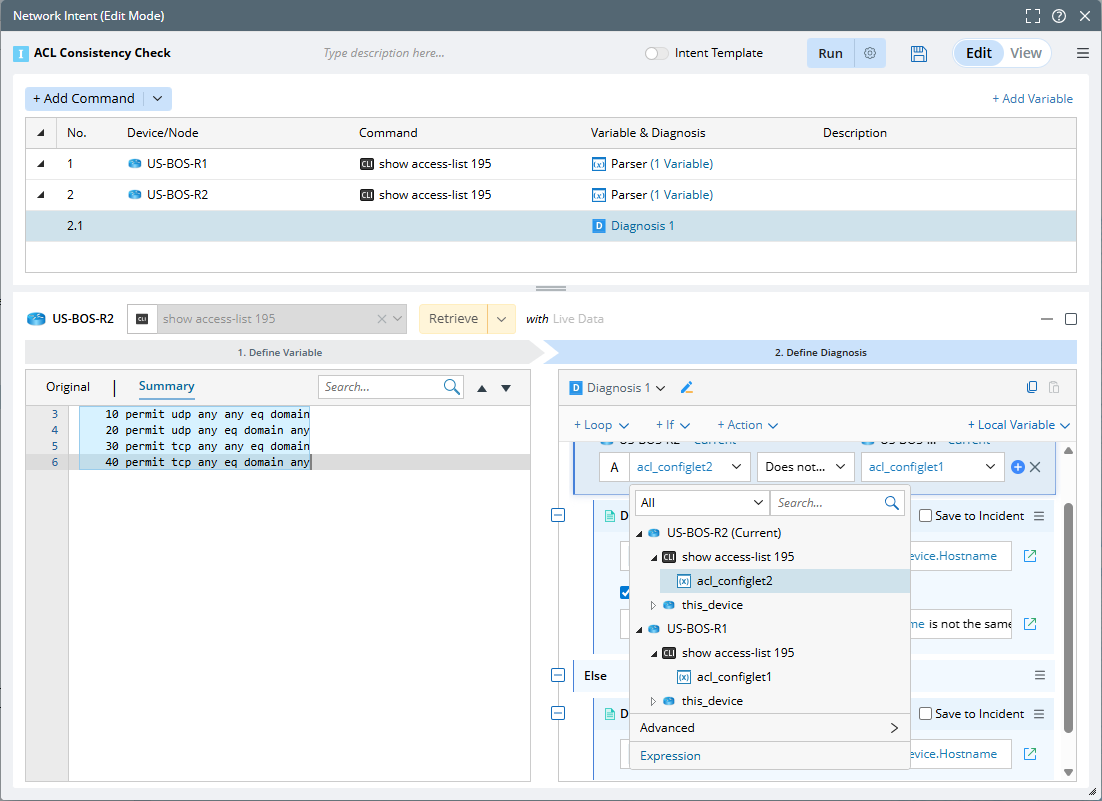 Example: Define an NIT to check ACL consistency between neighbor devices. To verify ACL consistency between the hub and spoke devices sharing the same ACL, issue the command show access-list $ACL_ID on the hub device to retrieve the ACL configuration. On the spoke device, use the macro variable $ACL_ID obtained from the hub device R1.