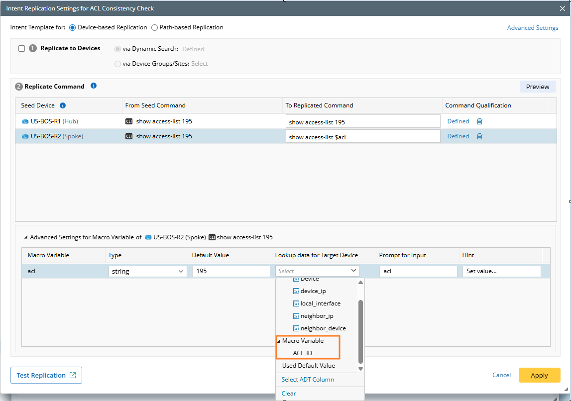 ACL_IDas the lookup source of the spoke device. This allows the values of the hub macro variable to be passed to the corresponding spoke macro variable.