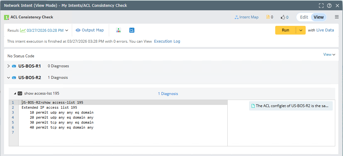 Define a diagnosis on US-BOS-R2 to verify ACL consistency between the two devices by checking the status codes after intent execution.