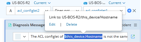 Note: When executing an intent to check the match between a device and its neighbor devices, you can define a diagnosis message that specifies the mismatched neighbor device. Use the variable $this_device.Hostname for each device and click it to view the specific device name in the diagnosis message. This ensures that device names are accurately reflected in the messages during intent execution.