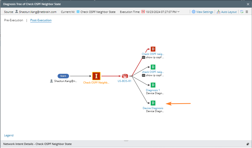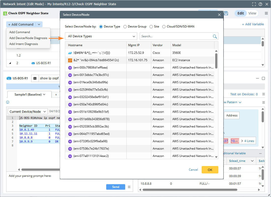 You can define a device diagnosis block without SNMP/CLI/Config/API command, which enables intent to be used as a shell, just to execute the subsequent follow-up intents. This kind of diagnosis can also be used to define the diagnosis based on built-in device data only, e.g., device route table or NCT.