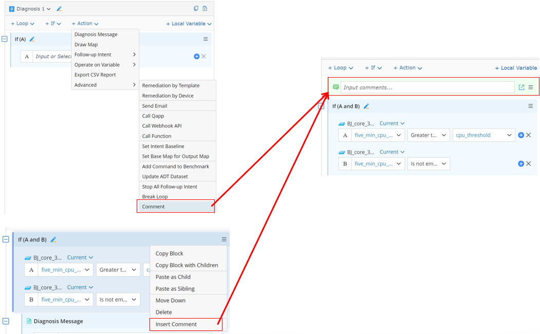 R12.3-20260213 Add Diagnosis Comment You can insert a Comment block to add annotations or explanations to the diagnosis logic. For example, it can be inserted as a sibling before the selected block.The Comment block can also be popped out. Add Command to Benchmark by Intent More Operations in Diagnosis