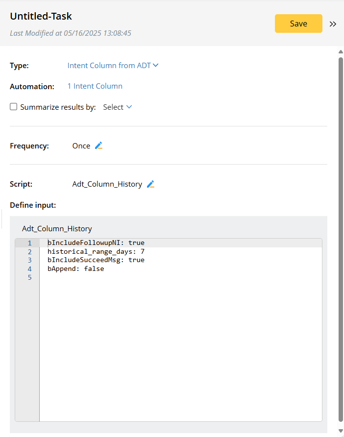 Script Description Adt_Column_History The historical results of intent columns in ADT. Adt_Summary The historical results of all columns in ADT. Dashboard_Summary The historical results of the dashboard GoldenIntent_History The historical results of a golden intent Intent_History The historical results of an intent