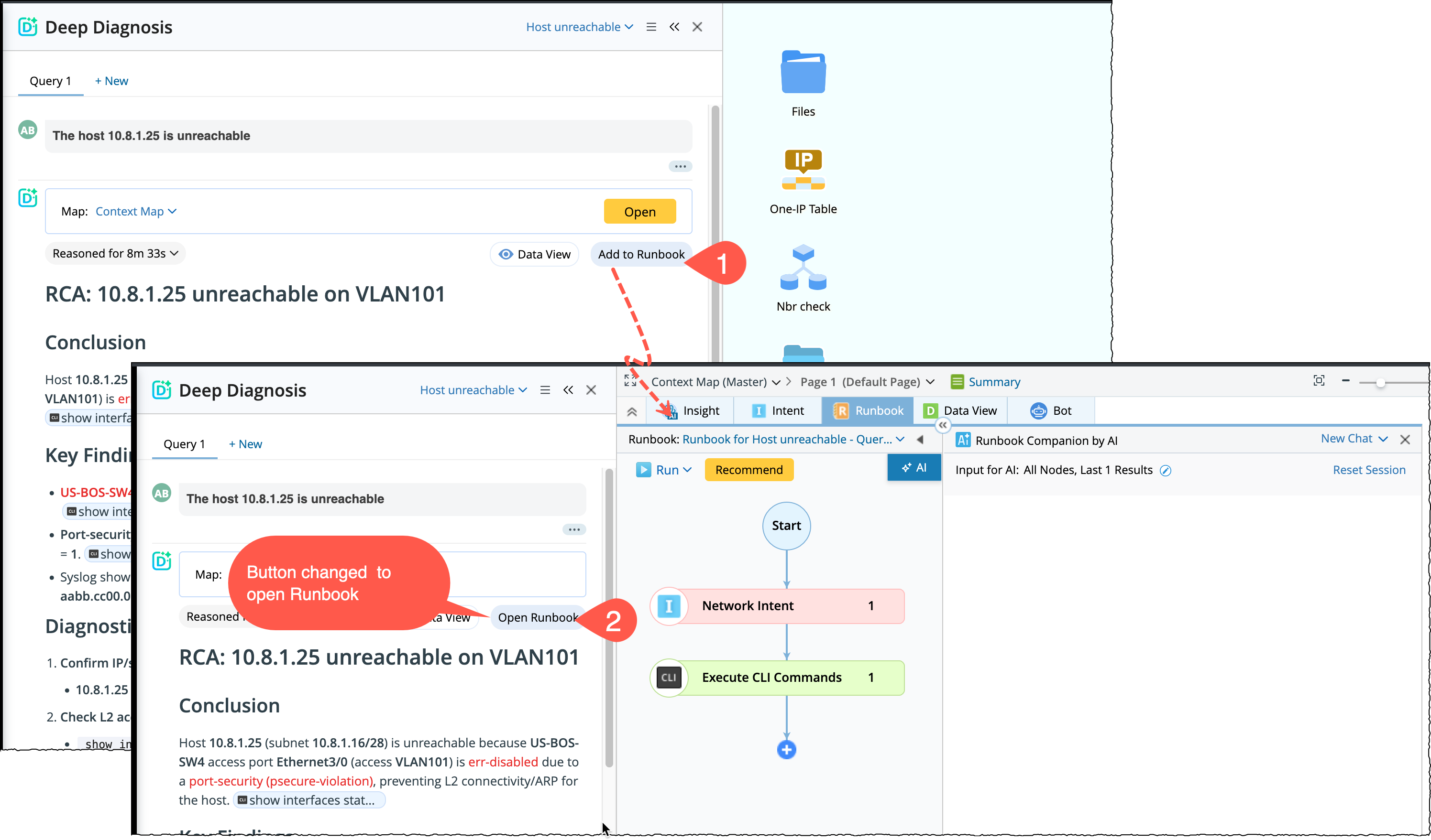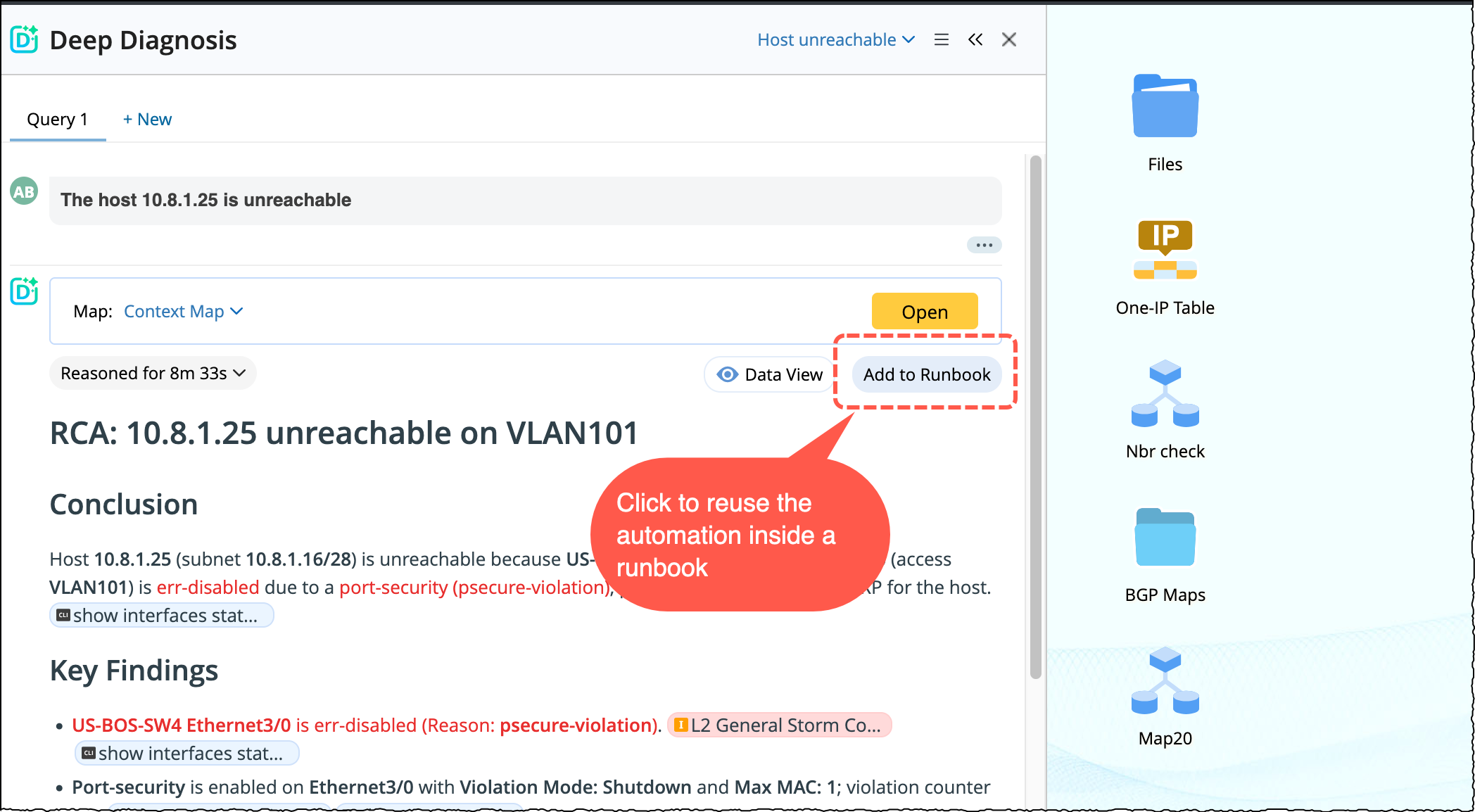 With this feature, you can start with deep diagnosis and then reuse all collected evidence and automations inside a runbook without redoing any work.