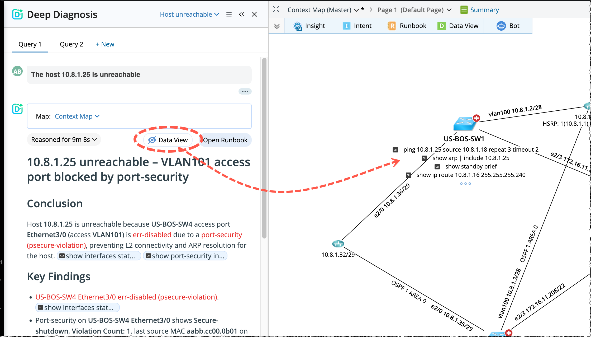 If a query was executed without using any existing map, click Data View provided in the deep diagnosis pane to visualize the results on the context map.