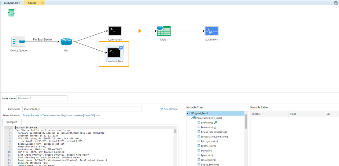 icon, select CLI and click Extend to add a CLI command node. - Enter show interface in the Command field and select show interface (Cisco IOS Switch, Cisco Router) from the drop-down list. The related command, parser, and variables will be auto-loaded.