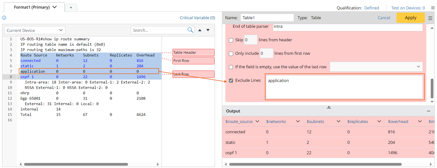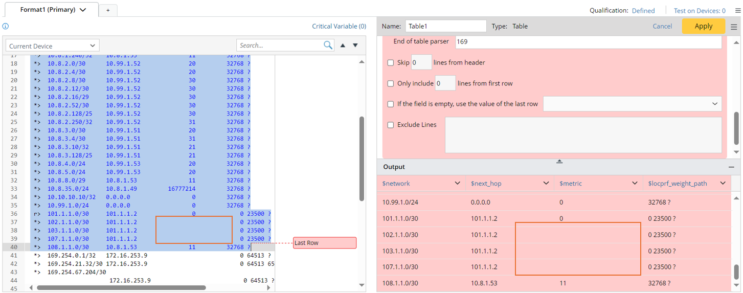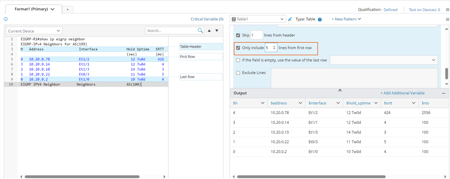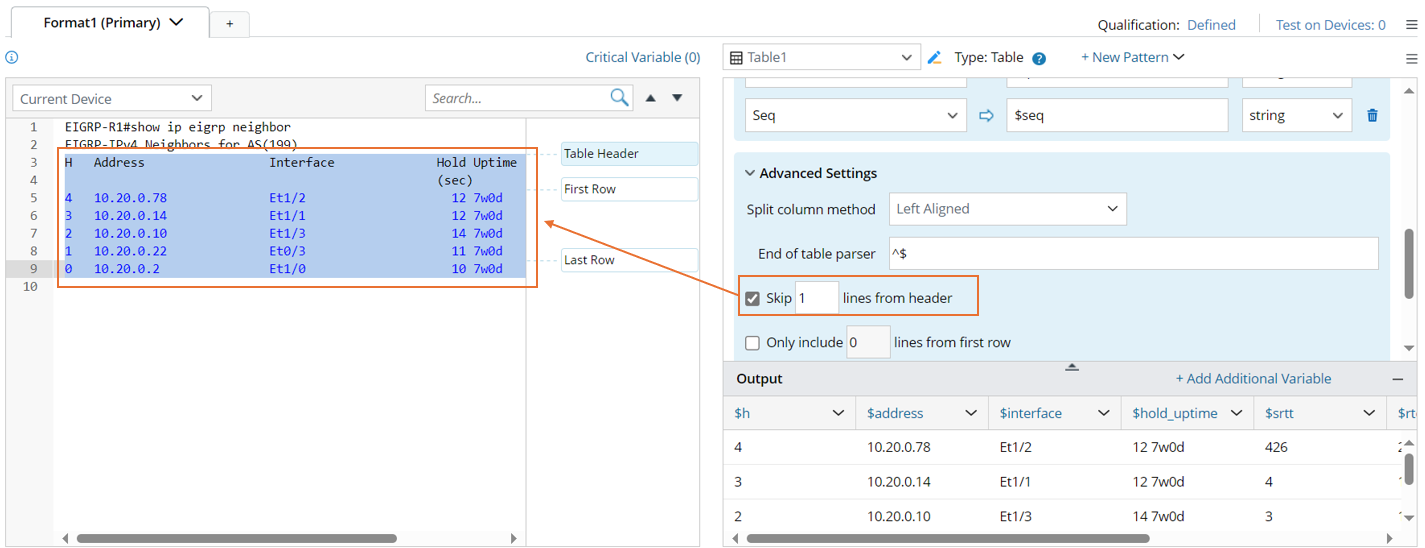 When there are extra lines between the line of the table header and the lines of the table rows, for example, the table header in the command output of 'show ip eigrp neighbor' is wrapped and occupies two lines. You can select to skip 1 line from the table header line in the Advanced Settings so that the unwanted lines will not be parsed.
