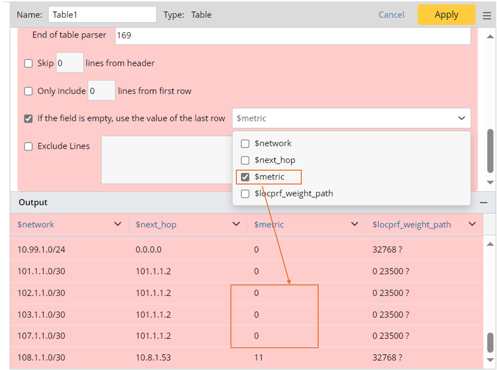 To resolve this case, you can enable the option If the field is empty, use the value of the last row in the Advanced Settings and select the Metric column. Then the parsed result will include all the required values as follows: