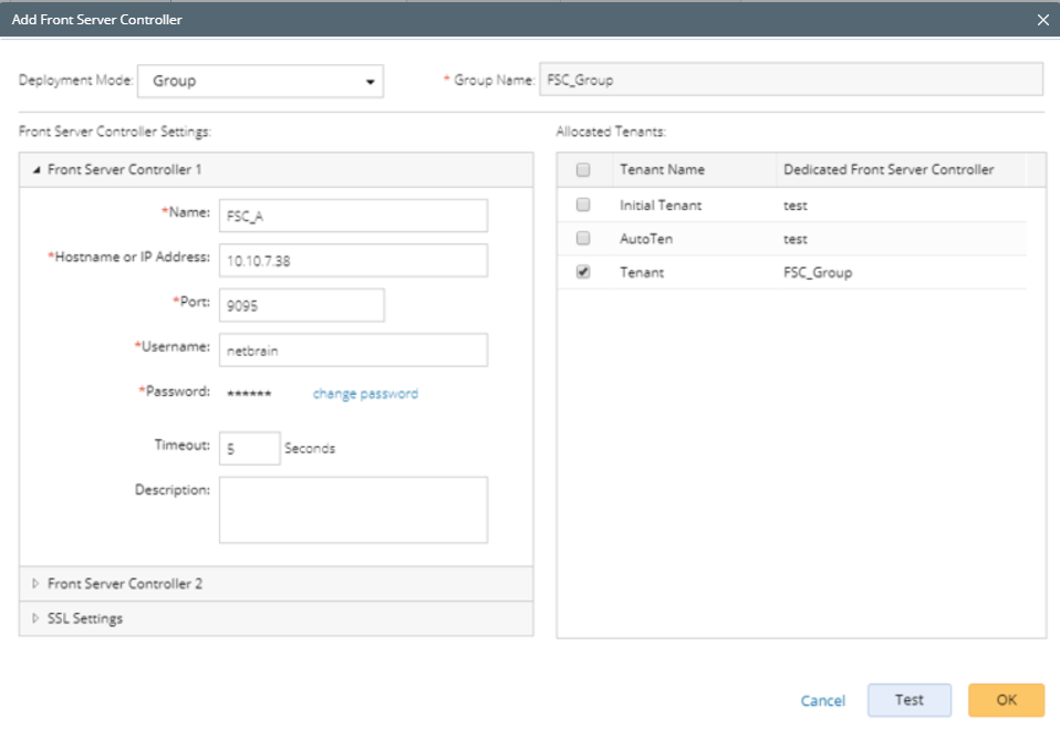 - In the Add Front Server Controller dialog, configure the settings for the Front Server Controller, and then allocate tenants to it.