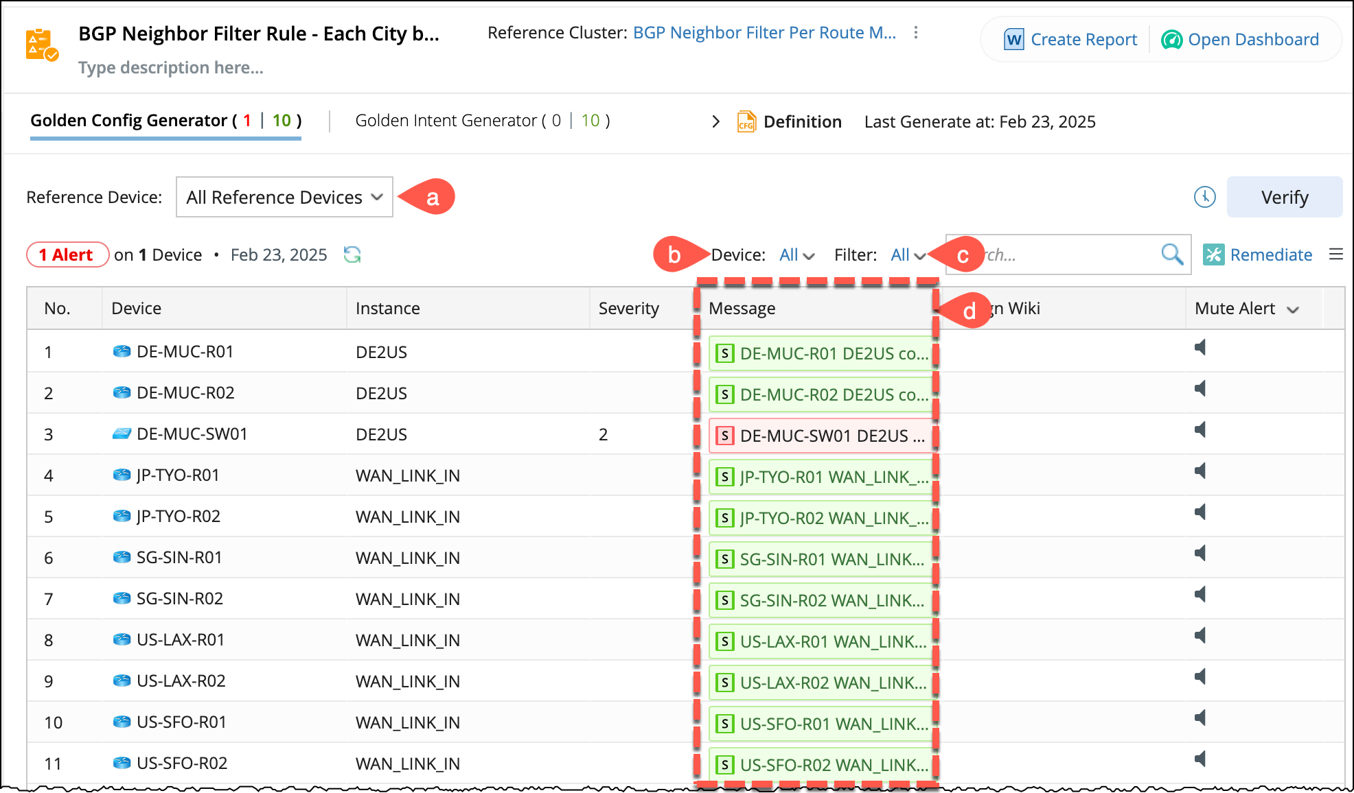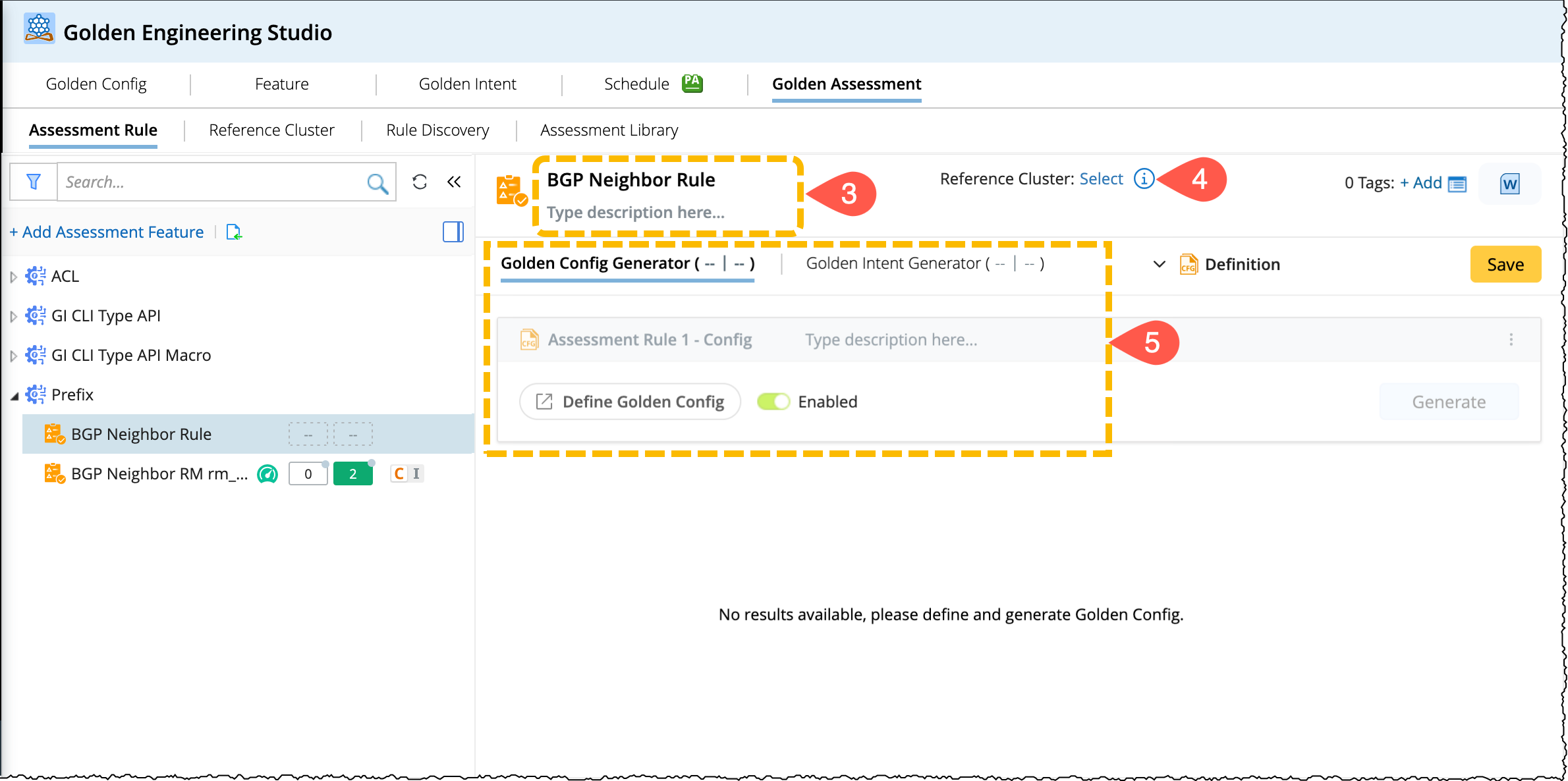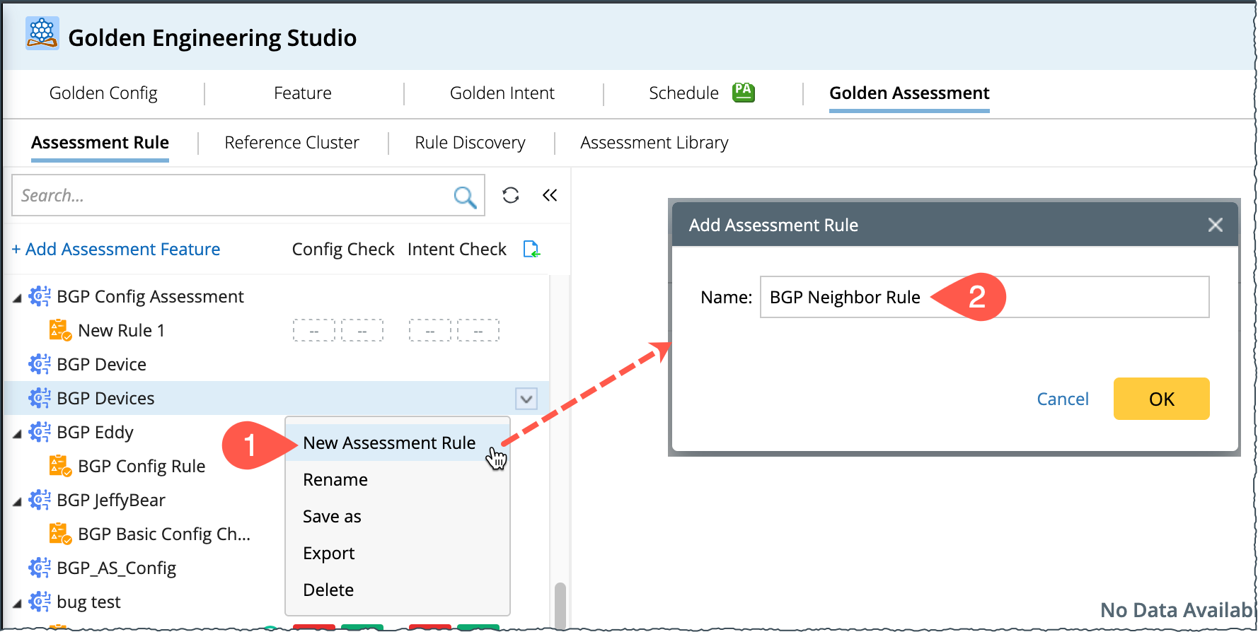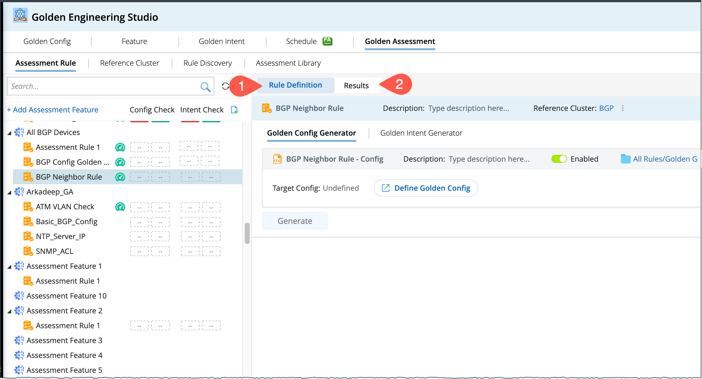 A golden rule can be defined with golden config or golden intents, and users can view the execution results within the assessment rule pane: