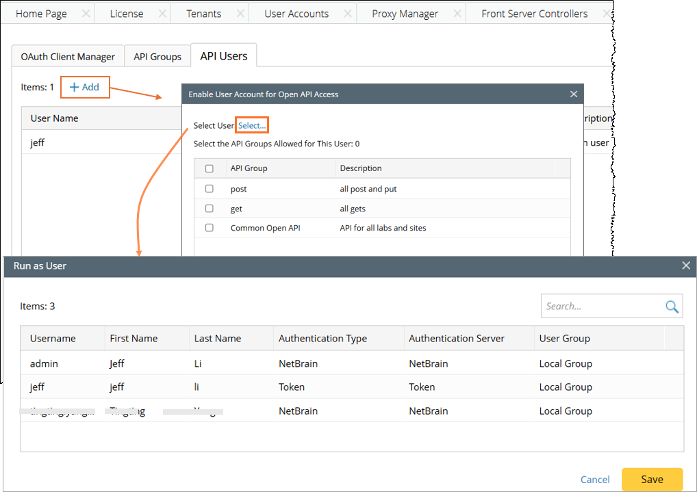 - Click + Add, the Enable User Account for Open API Access window will pop up. In this window, configure the following settings: