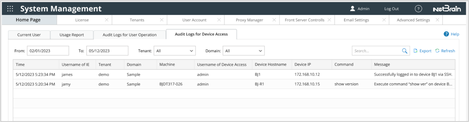 - View the log in the table below. You can view the details of the device access, such as time, username, tenant and domain, the machine, device access username, device IP, command used, and the message (status of login).The message section provides essential details about device actions, including login method, success or failure status, and executed commands. This information is valuable for monitoring and troubleshooting network devices. E.g.,a. Successfully logged in to device BJ*POP via SSH.b. Failed to log in to device BJ*POP via Telnet.c. Execute command "show ver" on device BJ*POP.In the Smart CLI, a uniform message, 'Log in device BJ*POP via SSH,' will be used for all login attempts.