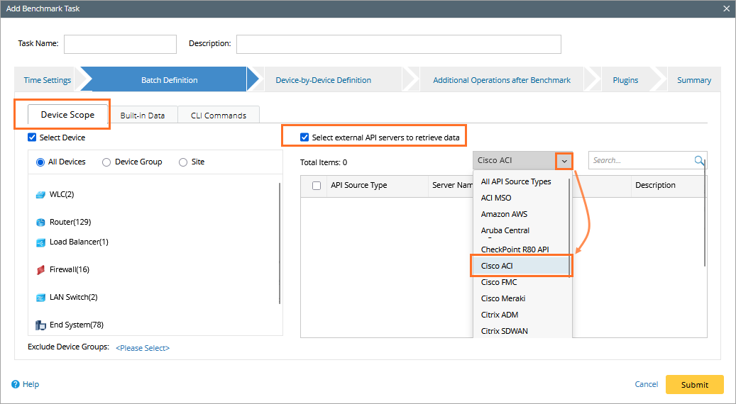 - Go to the Device Scope tab, check the Select external API servers to retrieve data checkbox and select Cisco ACI controllers.