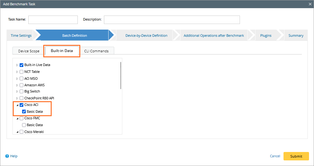 - Go to the Buil-in Data tab, and select the Cisco ACI checkbox.