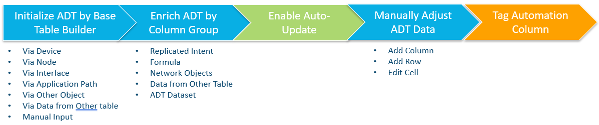 - ADT is a database for intents, supporting intent creation and replication. The system provides two methods (Base Table and Column Group) in Automation Data Table Builder to build the basic table data and create and bind the intent for each automation asset.